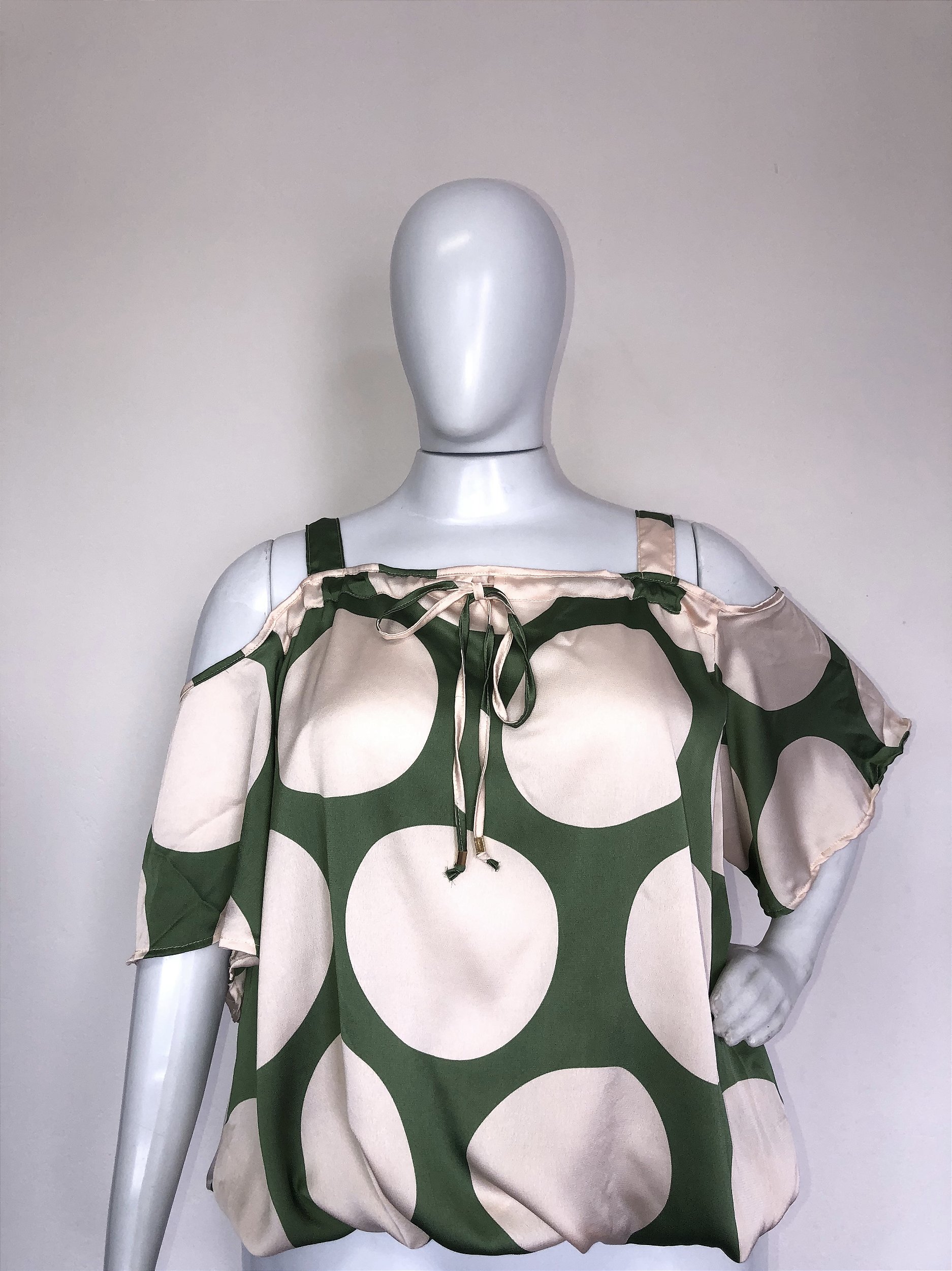 Blusa de manga curta modelo ciganinha na cor verde com estampa de poas creme, com um laço na gola. Com elastico na barra para dar esse efeito balone
